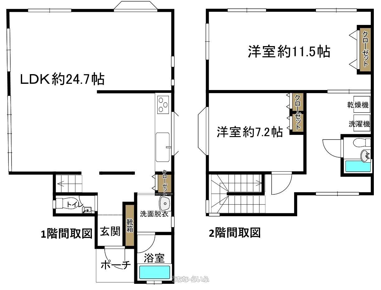 | 間取詳細 | 2LDK( 洋7.2 洋11.5 LDK24.7 )( ※ バストイレが一階と二階にあります ) | ||